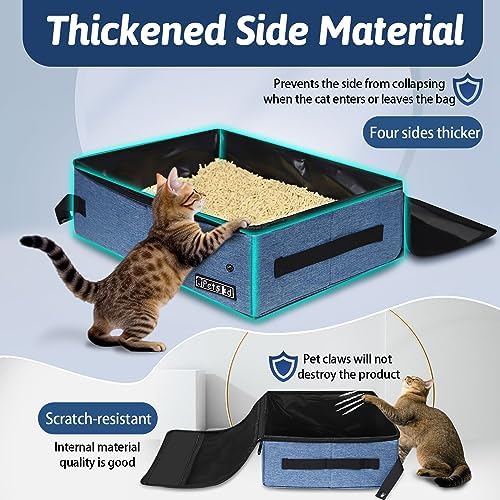 cat travel litter box [Perfect for Cat Travel] Cat travel litter box size is 15.7*11.8*5″, folding size is 8*3*6″. There is a large space as a cat’s toilet in the travel, our accessories come with a litter scooper, a roll of disposable liner bags(10 pcs), and a bowl for your travel with cats. The portable litter box allows you to carry it anywhere at any time while traveling.[Leakproof and Prevent odors]The inner material of the travel cat litter box is made of waterproof material, which can effectively prevent the liquid from leaking out, and we made a zipper lid so that you can close the zipper of the cover to avoid the odor from emitting when you don’t use the litter box. Ideal for use outdoors, in the car or in a hotel.[Sturdy and Light-weight]Litter box with lid main material is made of sturdy Oxford cloth that prevents cats from scratching and biting, the side parts are raised and reinforced to avoid pets getting in and out of the side collapsing and causing the litter to overflow, however, kitty litter box is really lightweight, so no matter where you go or where you transfer it, it’s all stress-free![Easy to Clean]The travel litter box’s internal waterproof material clean only needs to wipe, the outer material is dirt-resistant and support machine washable. we also send a roll of disposable liner bags(10 pcs), if you are not convenient to clean the litter toilet box in time, you can use the liner bag over the outside of the litter box and then directly into the trash can, it is really convenient and clean![Easy to carry]Special double handle design provides more carrying options, the travel kitty litter box folding is also very simple, and the folded litter box can be carried in a suitcase or handheld. The large space of the cat litter box with a lid can even be used as a kitty travel bag to put some pet supplies(pet treats, tissue, water bottle…), it will be convenient and multifunctional!